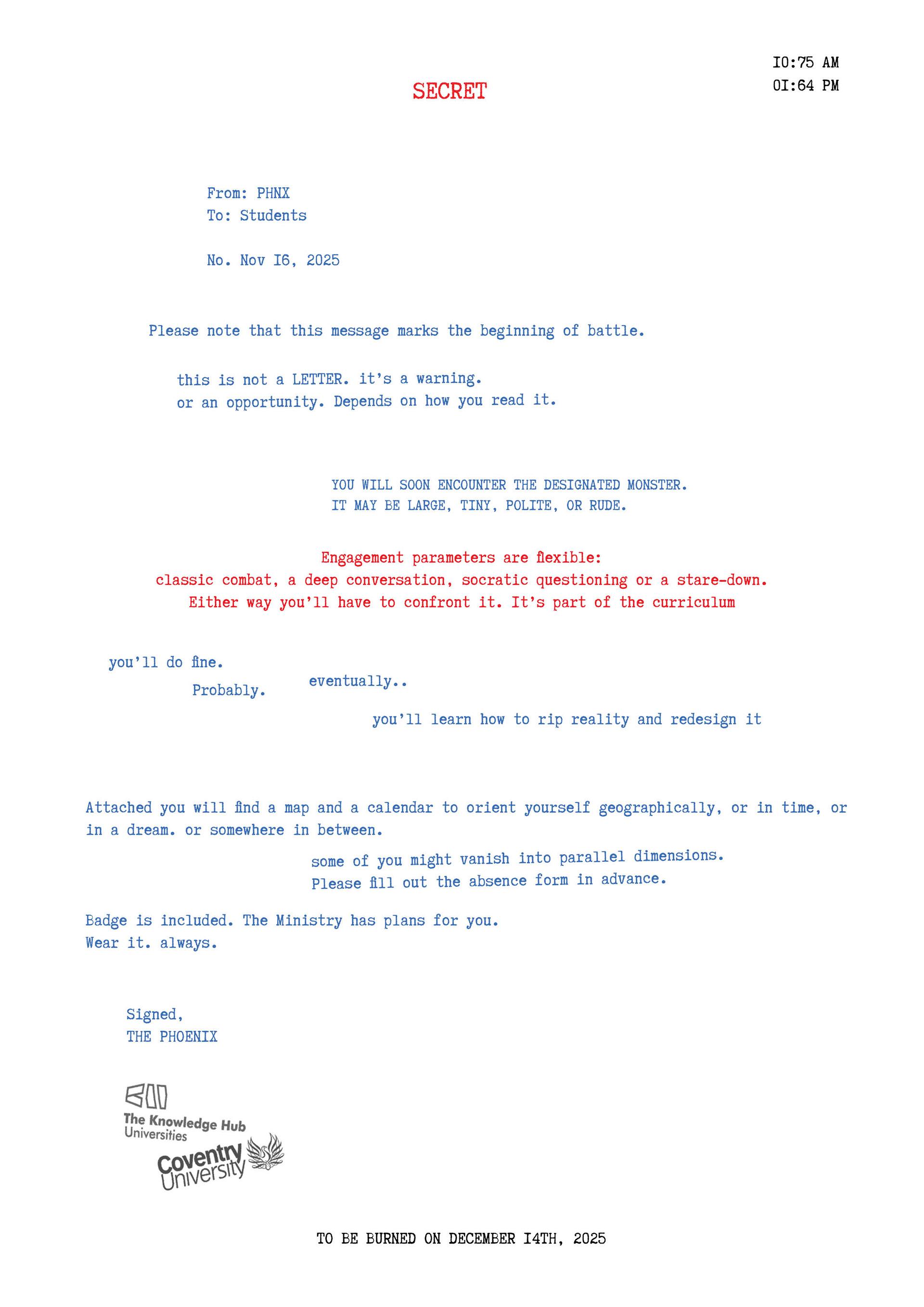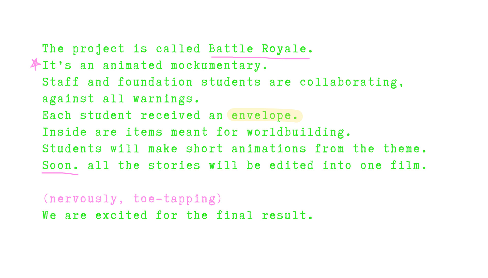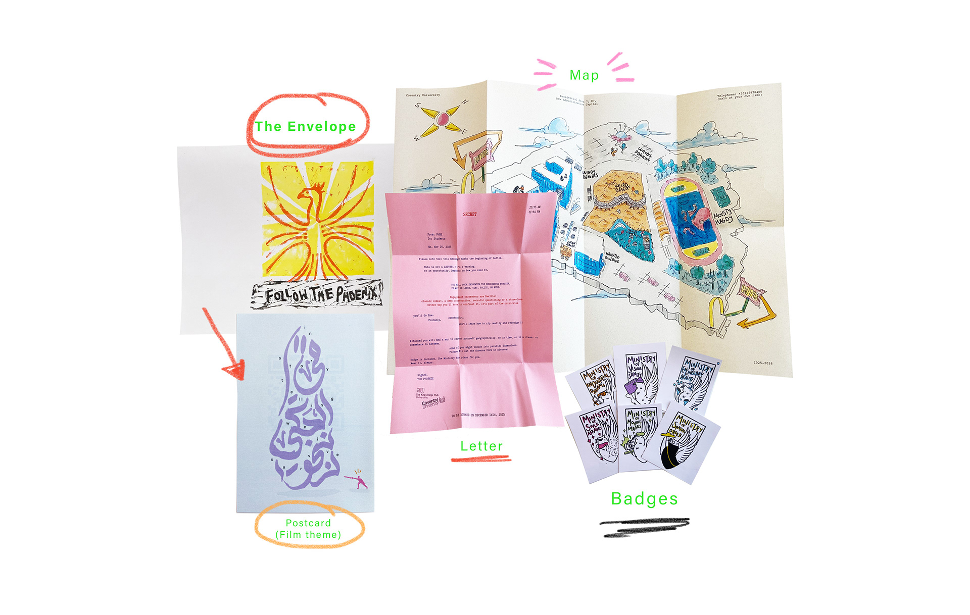 Each student received an envelope containing a map of campus, stickers of their majors, a postcard and a letter to guide the world-building for their film. It was intended as a mandatory prop for students to use, so that when all the scenes were edited together, the audience would recognize they exist within the same world. Students were free to interact with the envelope and its contents in any way they chose, as long as it was incorporated into the story. By the end of the final project, each student produced a storyline and a short rotoscope animation.